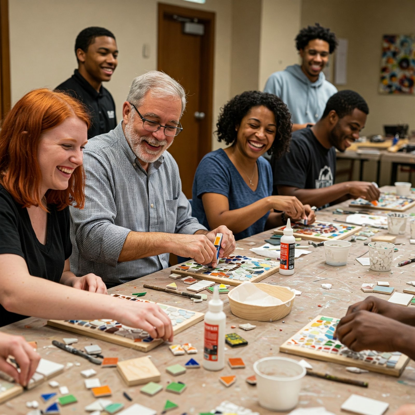 This engaging workshop runs for 90 minutes. It accommodates groups of 2 to 20 people. For larger groups, please reach out. Contact us for tailored arrangements. All necessary materials are provided. This includes tiles, hammers, safety goggles, glue, wooden boards, and design templates.